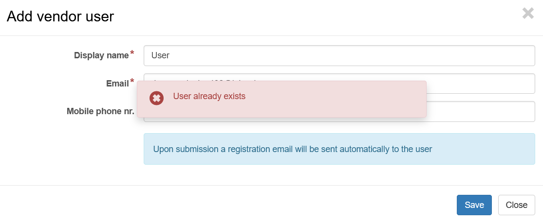 4) If the email have already been used in another account, a error message will appear ("User already exists").