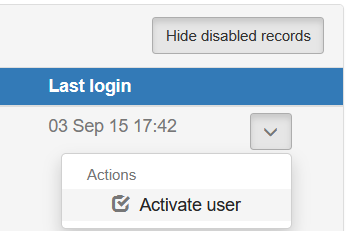 - If the account is disabled, you can reactivate it by clicking the down arrow at the end of the user row and selecting Activate user. Note that only vendor users with Admin privileges have permission to perform this action.