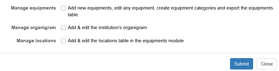 Only users with extra privileges can add new equipment, and edit the location and organigram tables.