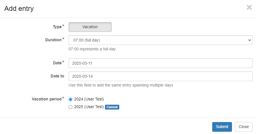 If your institution allows your vacation period to include dates in two different years (for example, your 2024 vacation plan may include some days in 2025), you can still submit your days easily with LabOrders.